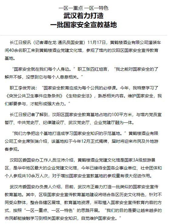 ? ? ? ?近日,黃鶴樓酒業(yè)黨建文化館內(nèi)的漢陽(yáng)區(qū)國(guó)家安全宣傳教育基地榮登長(zhǎng)江日?qǐng)?bào)。
