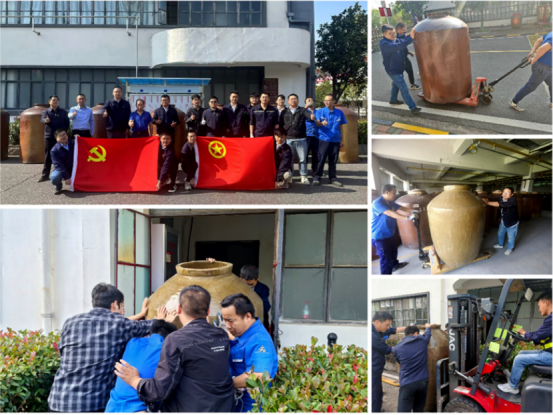 在轉(zhuǎn)移過程中,面對體型龐大、重量驚人的大陶壇,大家團結(jié)協(xié)作,采取科學(xué)高效的分組分工方式,確保搬運過程安全有序進行。經(jīng)過數(shù)小時的不懈奮戰(zhàn),33個噸位級大陶壇被順利搬運到廠區(qū)指定區(qū)域,并進行了景觀設(shè)計,為武漢廠區(qū)增添了一道亮麗的風景線。